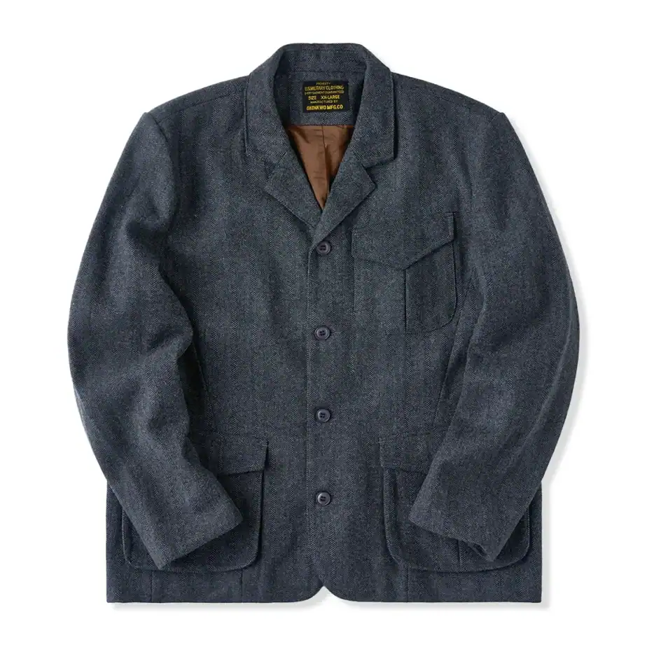 karakuウール混紡 チンストラップ付きヘリンボーンテーラードジャケットは、上質なウール混素材を使用し柔らかく暖かい着心地を実現。ヘリンボーン織りのクラシックな表情にチンストラップや3ポケットなどのワークディテールを融合。