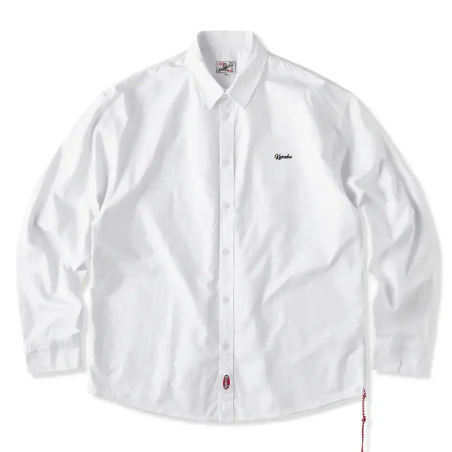 一枚でも重ねても決まる、karakuの定番シャツ。ほどよい厚みとハリのある素材が清潔感とこなれ感を両立。どんな季節も頼れる“ワードローブの軸”になるアイテムです。胸元のミニ刺繍と裾の赤い紐が、上品さの中に軽やかなアクセントを添えます。